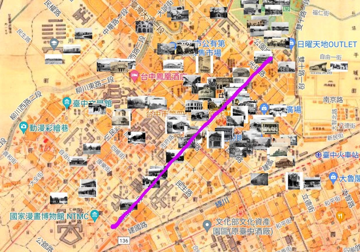 日本統治が始まると、清代の図と比べるとやや北寄りに台中の中心街が出来た。碁盤の目状の計画都市として中部台湾の中心地として発展、1942年(昭和17年)の人口は10万人を超えている。